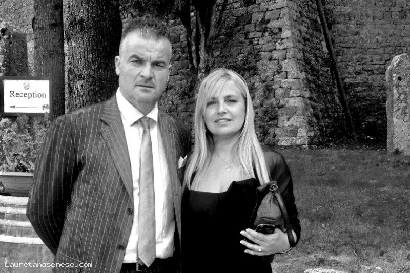 Un inconsueto Luca Barbi, "tirato a lucido", con la consorte Natalia Giannettoni, fotografati subito fuori dal Castello di Modanella, di lato al portone d'ingresso.