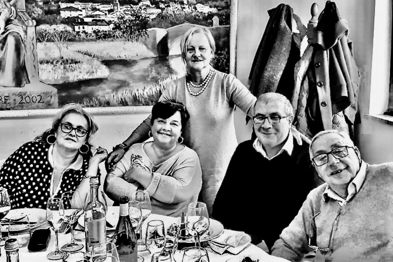 Un allegro gruppo di amici durante una cena nel salone della Misericordia.