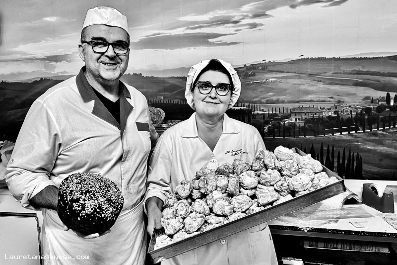 I fratelli Magini: Gianna e Gianpaolo, per fare gli auguri a clienti e concittadini, si lasciano fotografare con un bello sfondo delle nostre Crete e in mano: