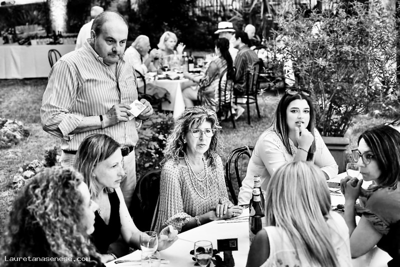 Un gruppo tutto al femminile, seduto nel giardino del Ristorante La Torre, sta ordinando al titolare del locale Gianfranco Giustarini, cosa intende consumare.