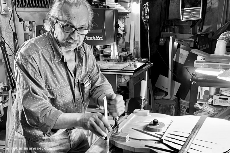 Il laboratorio, da lui gradualmente allestito nel fondo sotto casa, è un luogo magico pieno di attrezzi costruiti su misura per realizzare chitarre sempre più perfette: sia nell'aspetto che soprattutto nella produzione di suoni.
