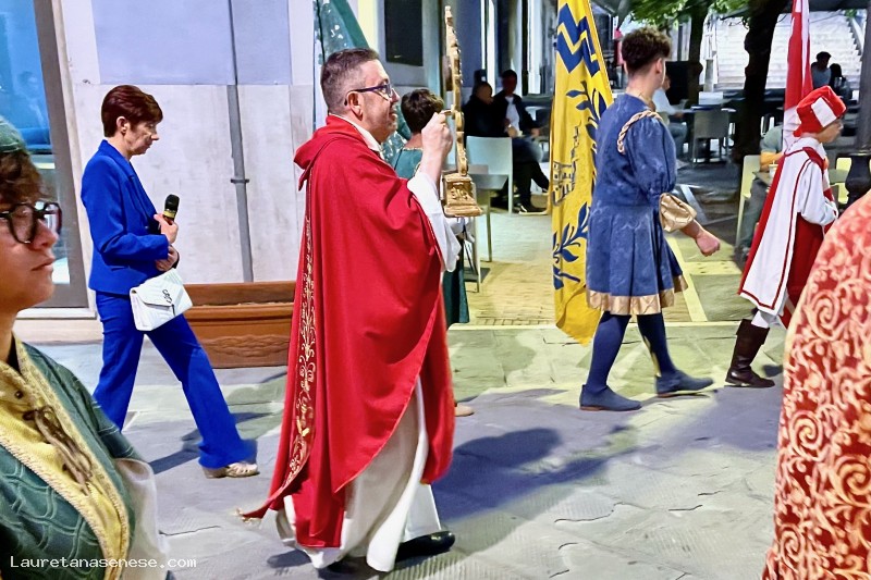 Il sacerdote è scortato dalle comparse delle contrade locali.