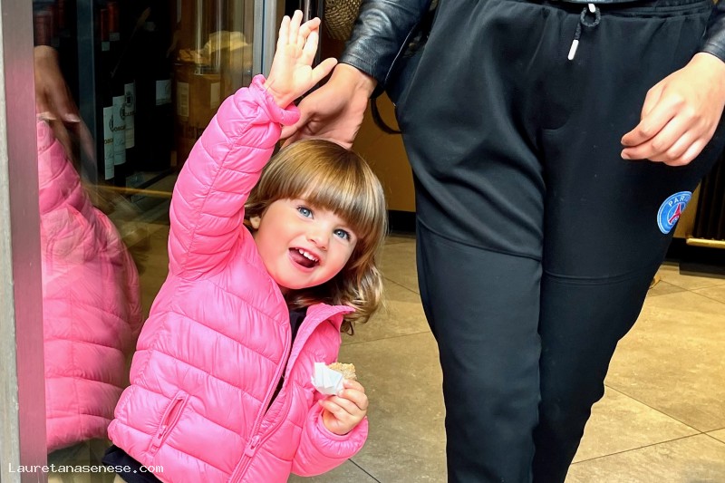 La piccola Livia, nipote di Bruno Donati, saluta felice da dentro il Bar del Menchetti, con un buon biscotto in mano.
