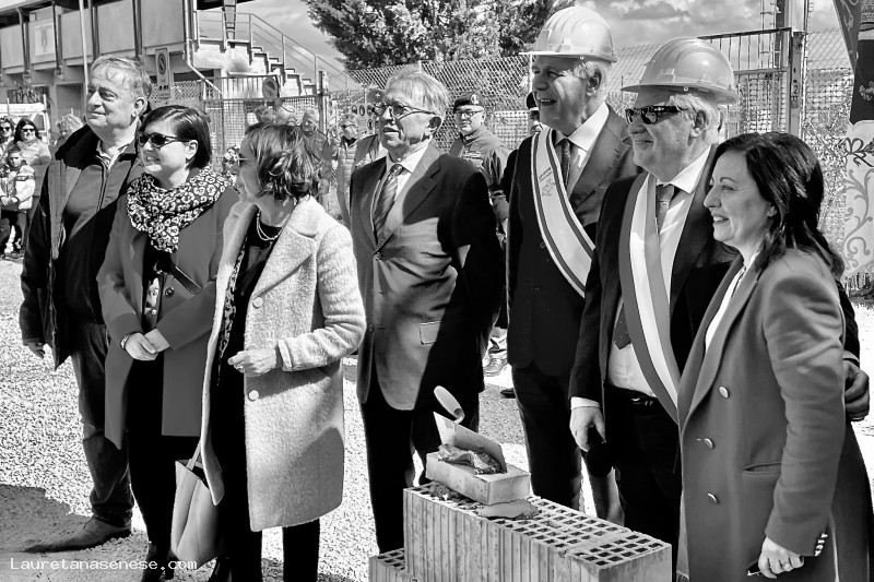 Foto finale dopo la posa del primo mattone. La cerimonia di avvio lavori del nuovo Polo Scolastico è iniziata con una conferenza a più voci, svoltasi stamani davanti alla Scuola Media in smantellamento.
