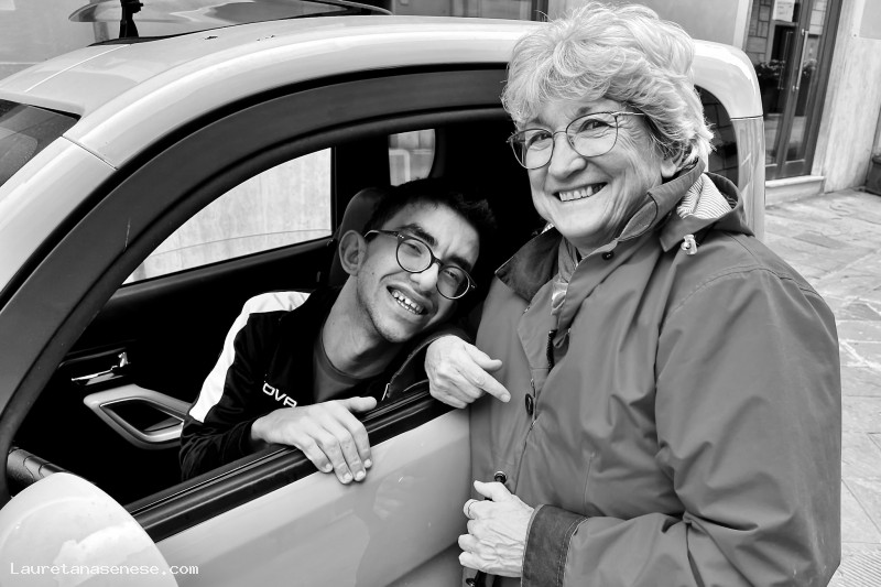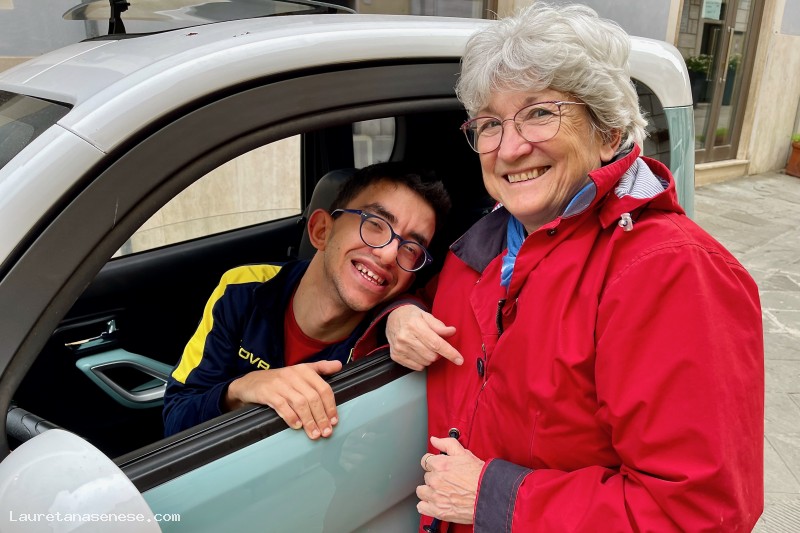 Alessio Decicco, pur abitando ad Asciano scalo, approfittando della disponibilità della sua piccola auto speciale, capita spesso in paese per trovare amici e conoscenti.