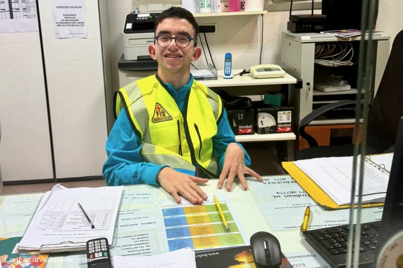 Qui è stato ripreso mentre presta servizio di volontariato presso il centralino della Confraternita.