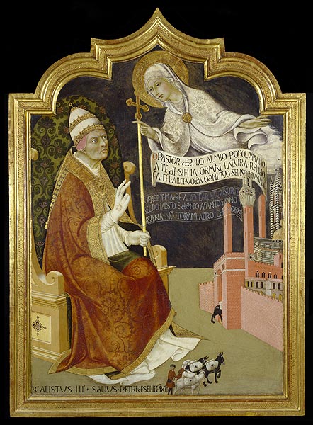 L'opera, firmata, rievoca l'episodio storico della carestia che afflisse Siena nel 1455 e rappresenta l'intercessione operata dalla Vergine verso il Papa Callisto III perchè soccorra la città. Le due figure sono enfaticamente raffigurate in forme più grandi rispetto al paesaggio; quest'ultimo rievoca con particolari veristici , il paesaggio con le mura di Siena e i muli che arrivano, coperti dal drappo con la balzana (lo stemma bianco-nero, simbolo della città), portando i sacchi carichi di grano. E' senz'altro una delle opere più affascinanti e riuscite di Sano, per la grazia compositiva, l'eleganza e la freschezza della narrazione.