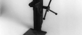 Torretta su cui poggiare una testa di trapano, presumibilmente del tipo elettrico portatile, per poter effettuare buchi di precisione su pezzi appoggiati sulla base