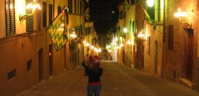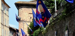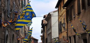 La contrada bianco-blu è situata su di una ripida erta che guadra la Valdichiana e ...