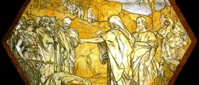 King Ahab went to war and get some wins. Commits a serious crime but killing Nachab, owner ofa nearby vineyard to his palace, with the aim of usurpargliela. At that Elijah predicted his imminent death, the scene shows the king prostrated at the feet of the prophet (I Kings 21: 21-22). This is perhaps the most emotional scenes drawn by the Franks and is characterized, like his other hexagons, in white, yellow and blue used for mosaics, on which were dug furrows in which to enter the pitch black, the traditional technique.
