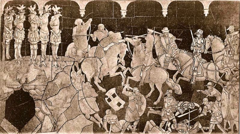 The Tarsia shows the battle between Jews and Amorites, surmounted by trefoil arches arches. On the left, above the cave where they had taken refuge, we see the figures of five kings of the Amorites hanged.