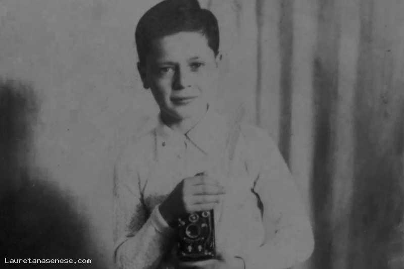 Un giovanissimo Ferdinando Dotti con in mano una delle prime fotocamere reflex.