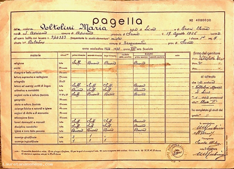 1935 - Pagella di Maria Voltolini alla Scuola Rurale di Belsedere Asciano