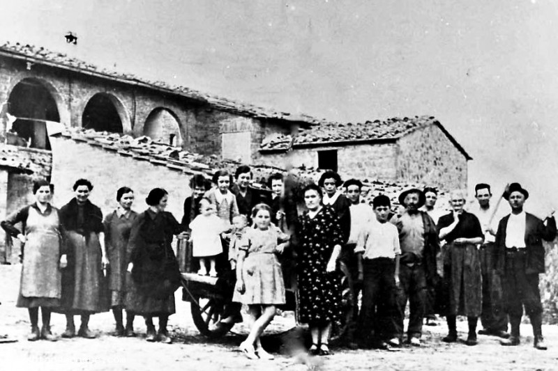 La famiglia Dominici nell'aia della Casanova di Palazzo Venturi, per una foto di gruppo. A quel tempo la famiglia era piuttosto numerosa, infatti contava ben 22 persone.