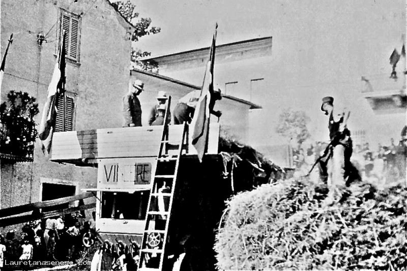 Particolare della Tribbiatura in Piazza Garibaldi, che evidenzia il motto scritto sul retro della macchina trebbiatrice, voluto dal regime fascista "VINCERE" con sotto il tricolore.