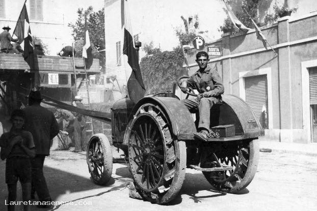 Bella foto di Renato Barbi sul trattore utilizzato, in piazza Garibaldi, per effettuare la tribbiatura del grano. Questo trattore che, a guardarlo oggi, appare una specie di ferro vecchio, all’epoca nei primi anni ’40, era quanto di più moderno potesse esistere.