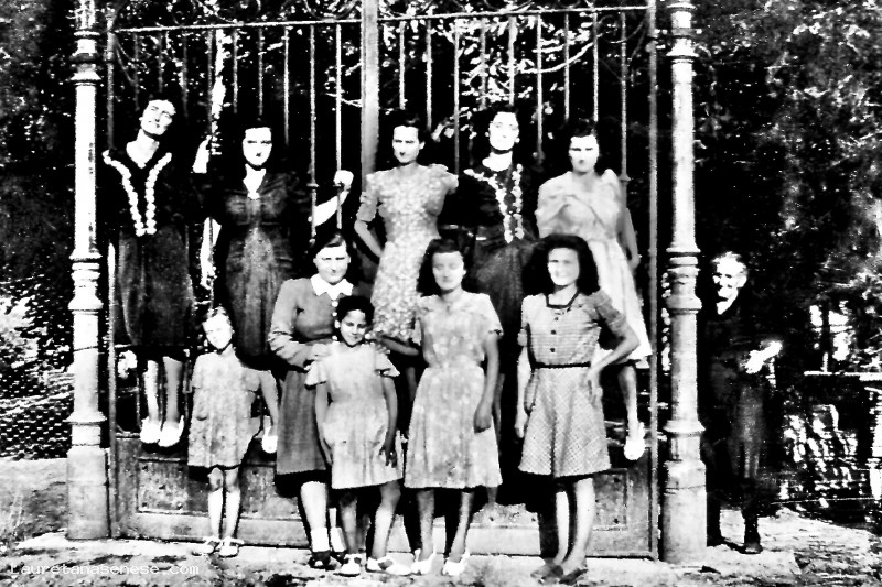 Un numeroso gruppo di ragazze e ragazzine abitanti a Rencine, appoggiate al cancello d'ingresso alla villa, per una foto di gruppo.