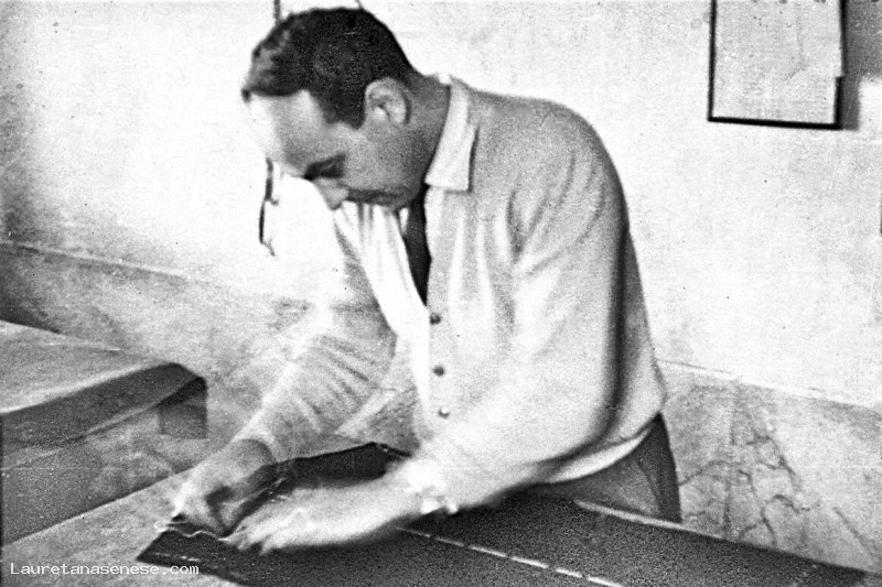 Foto che ritrae il sarto, Gino Pieri, intento a segnare con il gessetto la stoffa da tagliare per la realizzazione di un abito. Il Pieri, babbo di Fabio, è purtroppo morto nei primi anni '50 per una grave malattia allora difficile da curare.