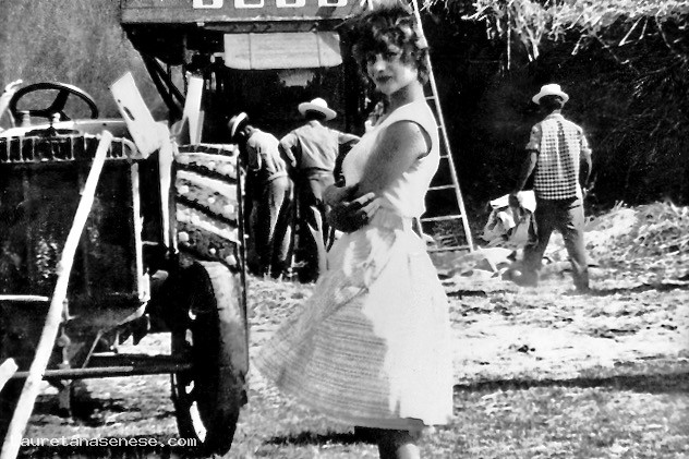 Particolare di una foto scattata a Scacciacucculi durante la tribbiatura del 1953. La ragazza in primo piano, essendo in età da marito, non ha perso occasione per mettersi in mostra. Infatti la tribbiatura, oltre all’impegno degli uomini di famiglia richiedeva il supporto di amici e conoscenti, provenienti dai poderi vicini.