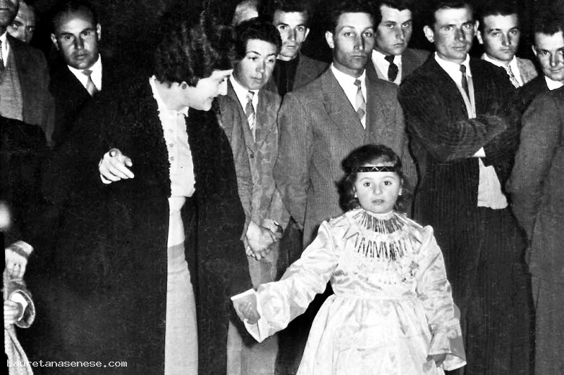 Questa foto è speciale, non tanto per l'immagine di una piccola Beatrice Mancini, di 5 anni per mano a mamma Maria Luisa, ma il folto gruppo di uomini sullo sfondo, fra quali si riconosce un giovanissimo Ercole Bassi.
