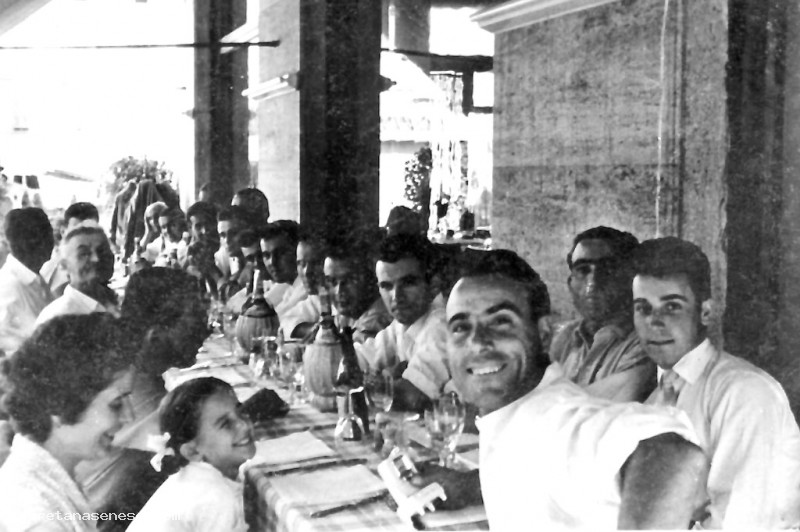 Questa foto è simile all'altra pubblicata di pari data e ritrae un gruppo di ascianesi seduti sotto il portico di un ristorante. Dovrebbe trattarsi del pranzo consumato a Piombino, in occasione di una trasferta della Filarmonica Giuseppe Verdi.
