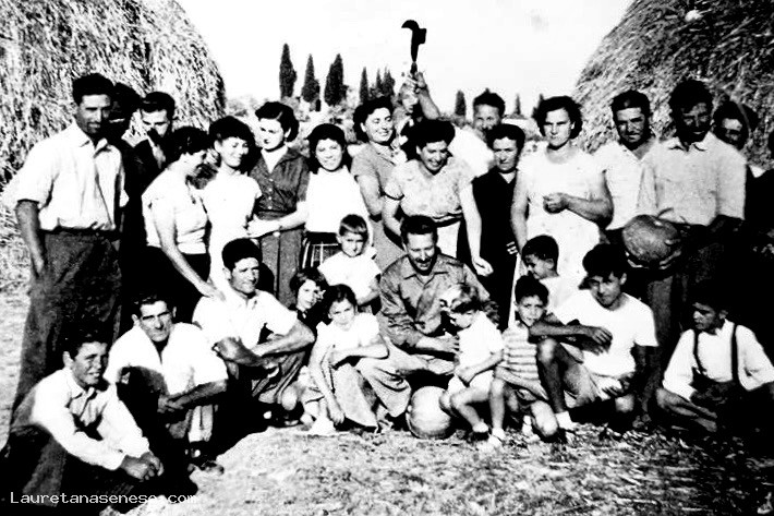 Foto che immortala la comunità di Leonina, radunata nell'aia del podere La Fonte per una foto ricordo con il giovane maestro della scuola rurale costruita recentemente vicino al podere.