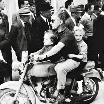 Palmiero in moto con due bambini, partecipa al corteo del 1° Maggio lungo il corso Matteotti.