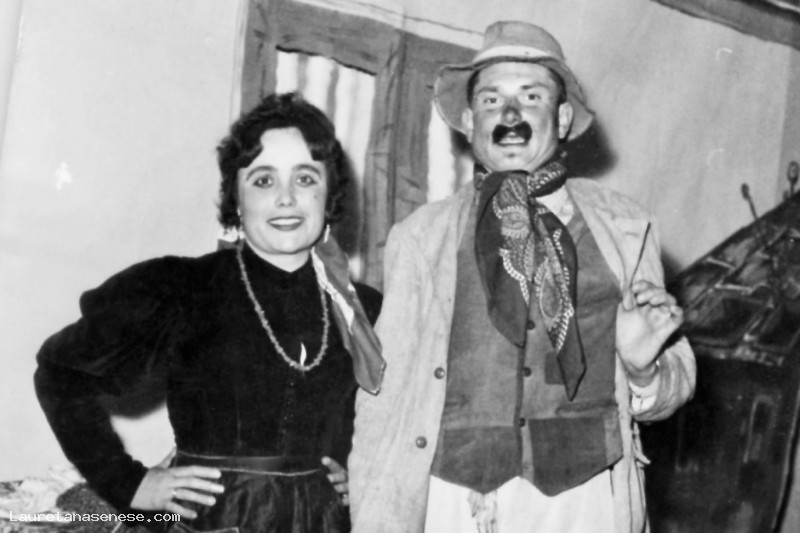 Una giovanissima Rema Carniani e un altrettanto giovane Elvio Angelini vestiti da campagnoli, mentre recitano insieme.