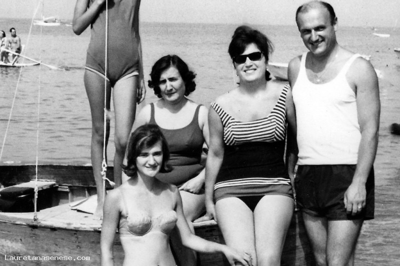 Mario Farfarini con la moglie, la sorella Attilia e le due nipoti di Siena, tutti appoggiati su una barca a vela spiaggiata.