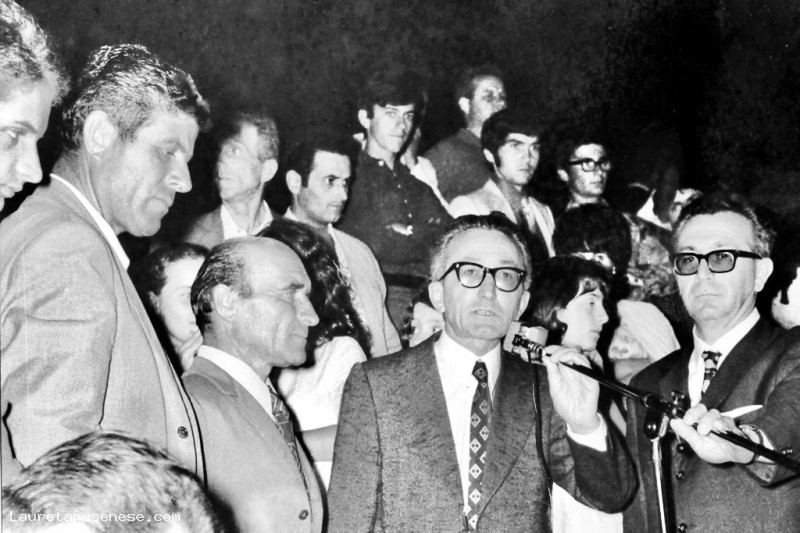 Il Senatore Luciano Mencaraglia, eletto a Siena nelle file del PCI, porta il saluto agli espositori della Mostra, circondato da autorità locali e cittadini.