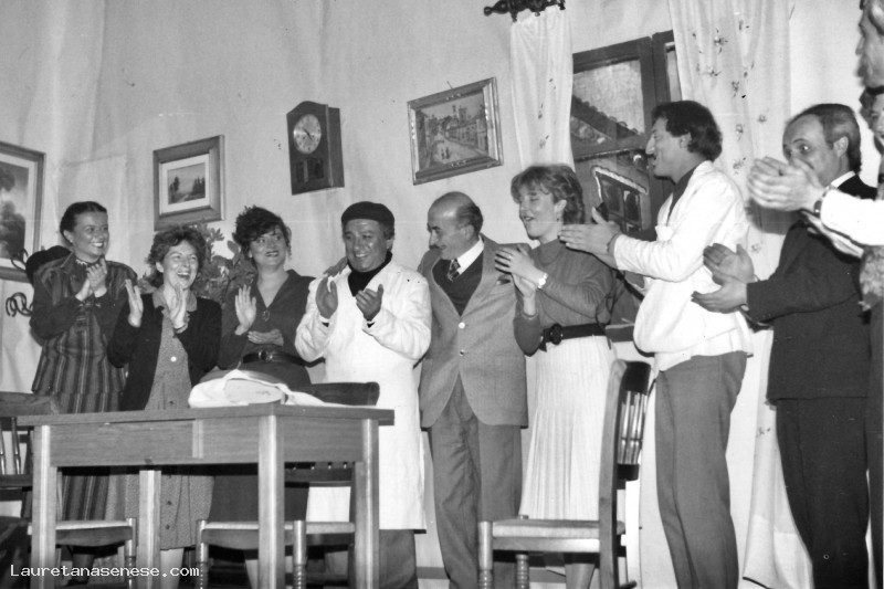 Come allora avveniva, le rappresentazioni teatrali si svolgevano al Cinema Parrocchiale. La commedia messa in piedi dalla compagnia amatoriale LA SCIALENGA è stata scritta e coordinata da Bruno Neri, al quale sembra siano rivolti gli applausi di tutti gli attori, alla fine della rappresentazione.