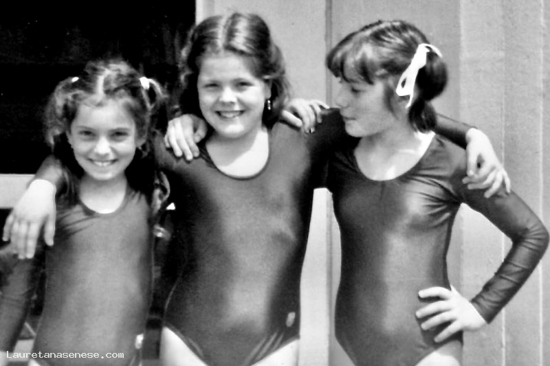 Tre piccole amiche che condividono la passione per la ginnastica artistica, ritratte subito fuori dalla palestra che frequentano per prendere lezione:
