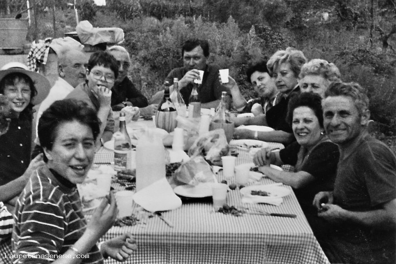Dopo aver vendemmiato nella villa di Luigi Fagnani, tutti i parenti e li amici che hanno partecipato si ristorano con un allegro pasto all'aperto.