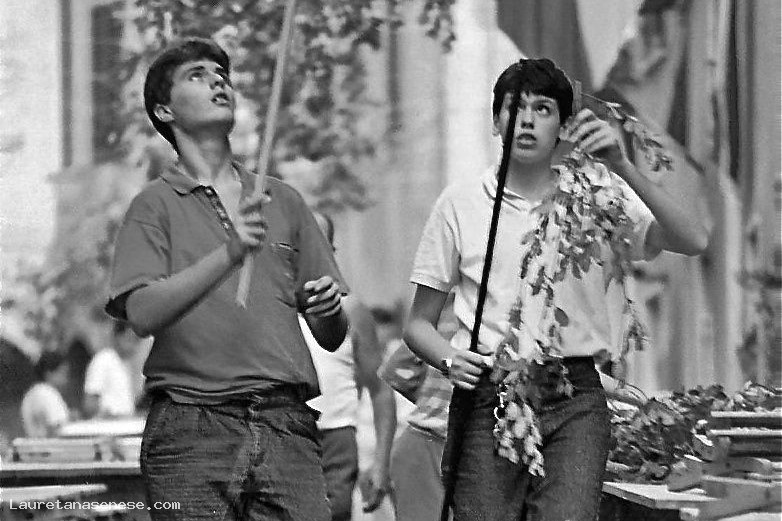 Questa è proprio un’istantanea a sorpresa che coglie i due contradaioli impegnati ad abbellire con ramoscelli appesi ai “fildiferri” volanti, fissati sopra allo spazio destinato a commensali.