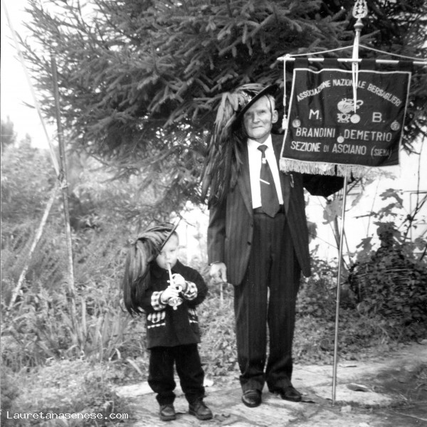 Bellissima foto di Luca con il cappello da Bersagliere e il flauto in bocca, ritratto con il nonno materno: Dino Toniaccini, ex Bersagliere e socio del gruppo locale, di cui tiene in mano il gagliardetto.