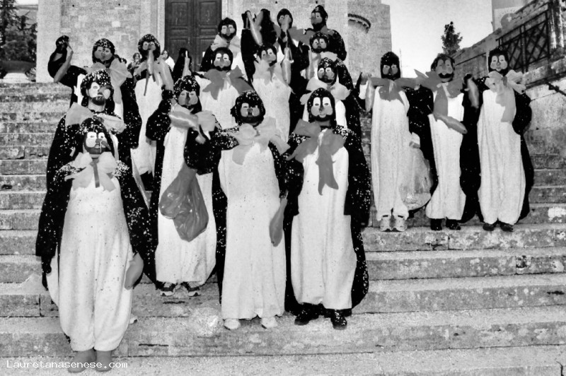 Gruppo di maschere adulte, difficilmente riconoscibili, che si fanno fotografare sulle scale della Basilica di Sant'Agata.