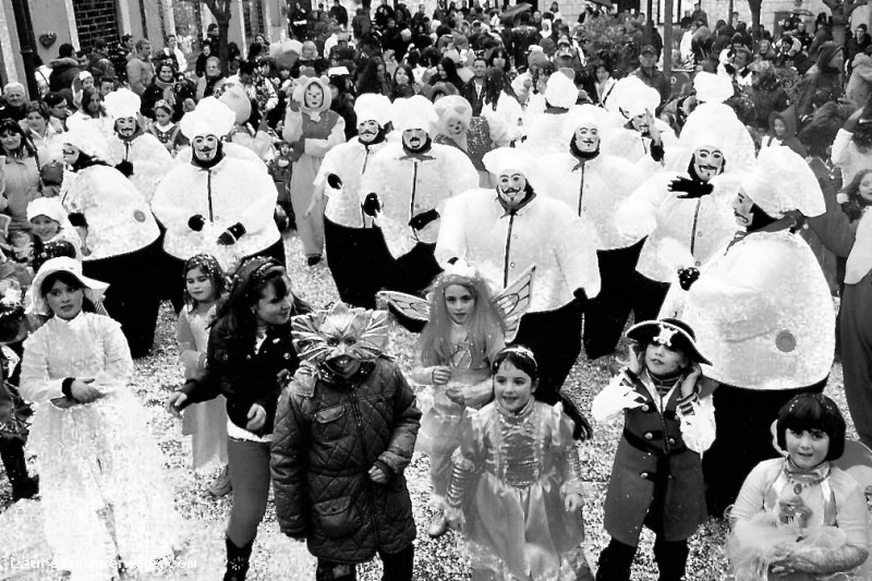 Grande affollamento di maschere in piazza Garibaldi, molte delle quali tutte uguali e quindi difficilmente riconoscibili. Altra cosa sono i bambini in primo pano. Chi ci aiuta a riconoscerli?