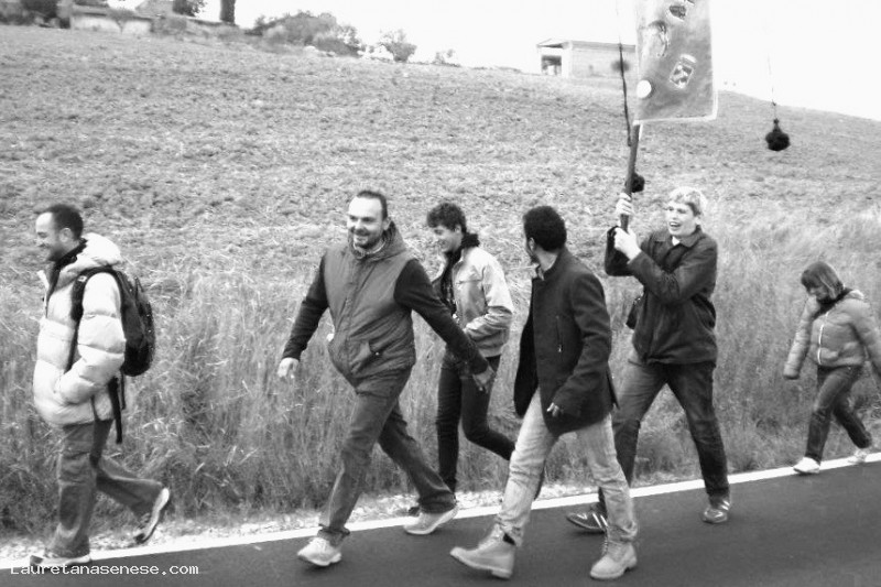 Gruppo di contradaioli della Corona che percorrono la strada per San Giovanni d'Asso, all'altezza di Vaccareccia.
