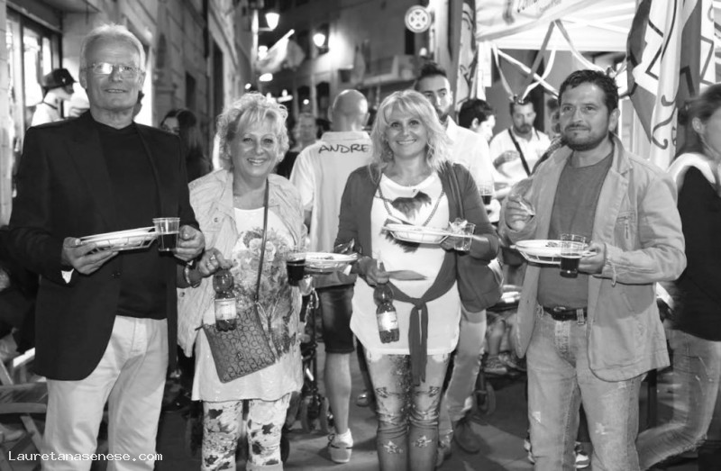 Spartaco Sani e glialtri tentano di fare uno spuntino in piedi. Sarà difficile distrigarsi fra piatto, bicchiere e bottiglia.