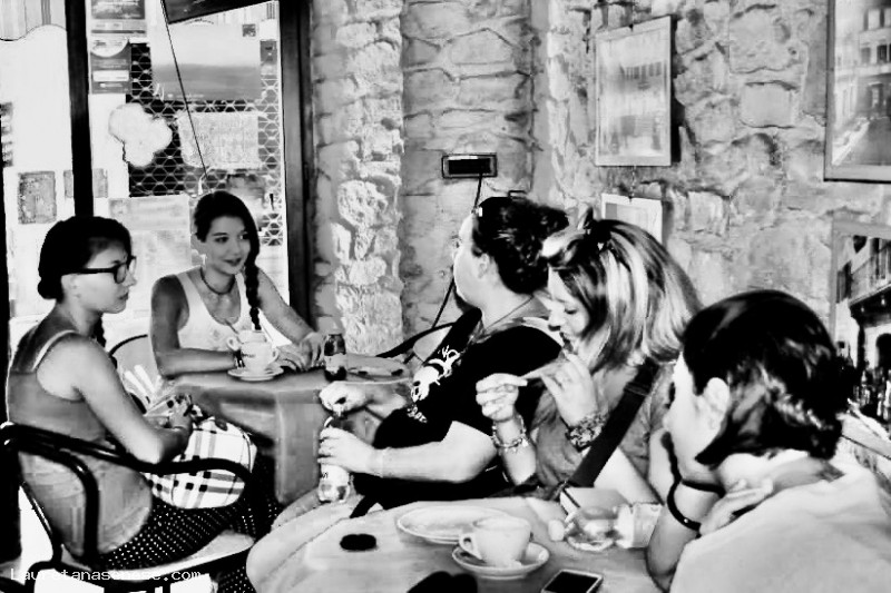 Gruppo di ragazze locali che hanno cercato un momento di refrigerio all'interno del Bar Hervè, un mattino estivo pieno di sole.