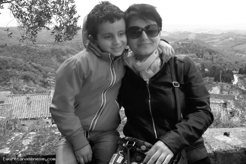 Antonella Conte con l'amato figlio Matteo, immersa in uno splendido paesaggio delle Crete, in occasione della Festa del Carciofo di Chiusure.