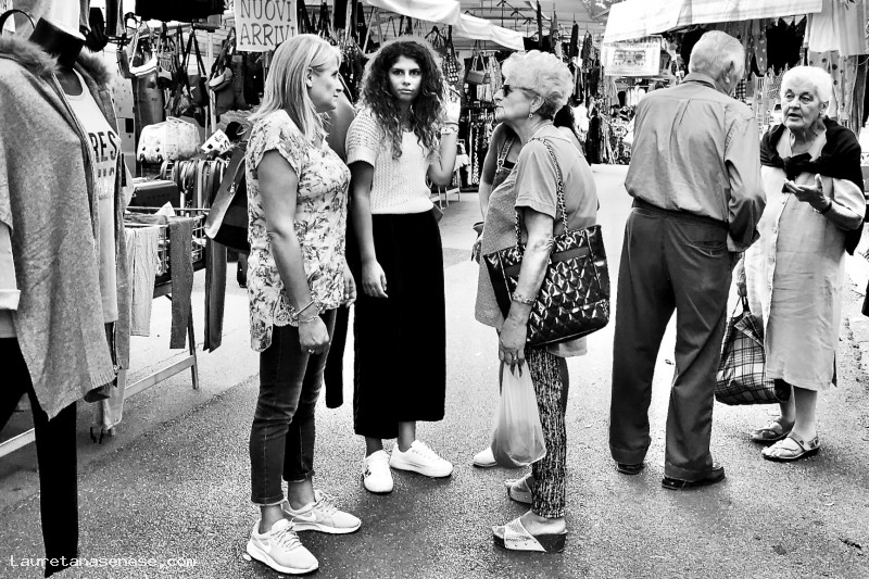 Gruppetto di persone, con legami di parentela stretta e prevalentemente residelti in viala Gramsci, intente a confabulare davanti ai banchi del Fierone: