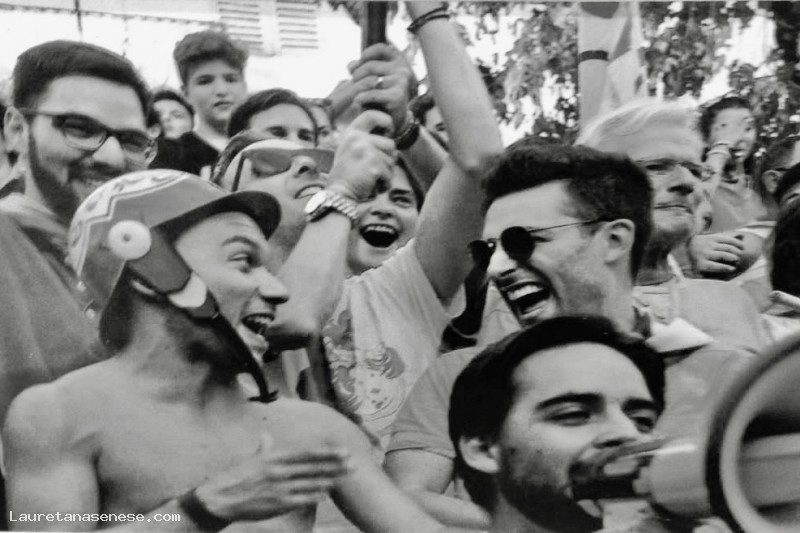 Antonio Deriu detto Pampero, fantino della contrada del Prato, circondato dai contradaioli festanti, immediatamente dopo aver tagliato il traguardo.