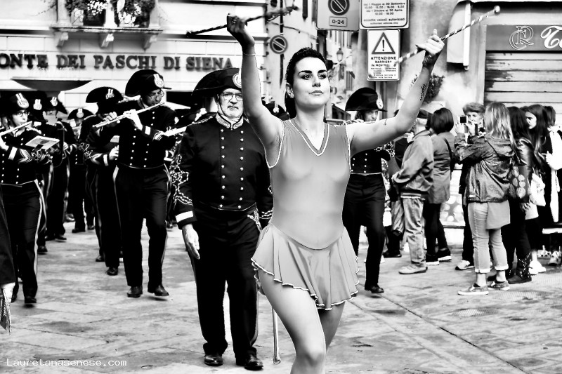 Nella foto la Majirette: Irene Giommarelli guida la prestigiosa Banda durante la trazionale sfilata per le vie del centro storico
