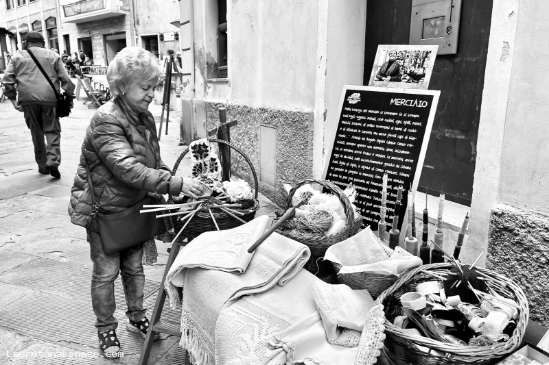 Concetta Tinagli si presta con impegno a rappresentare la Merciaia, esponendo anche prodotti di sua proprietà realizzati con l'uncinetto.