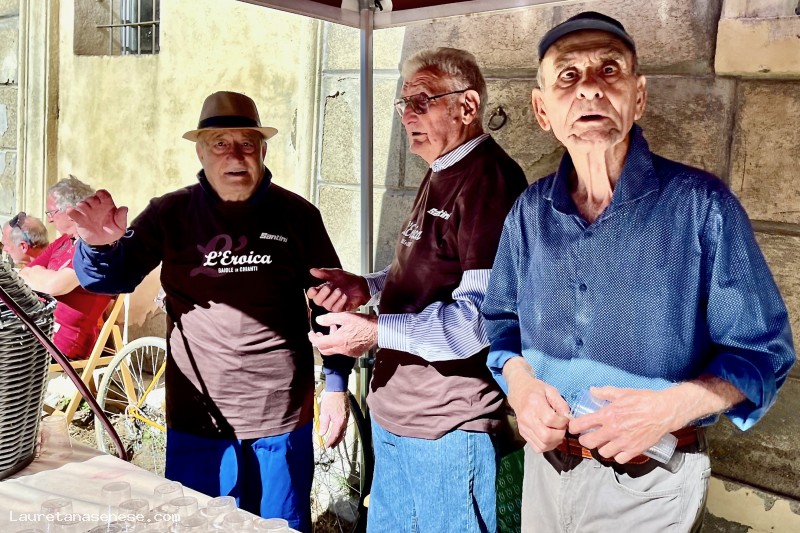 Tre volontari addetti al rifornimento dei ciclisti eroici.