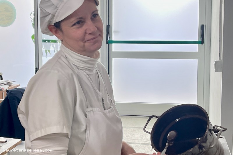 Tra questi Lucia Croci, che stamani abbiamo sorpreso a preparare il buon cioccolato fondente da utilizzare per il confezionamento di paste e dolci.