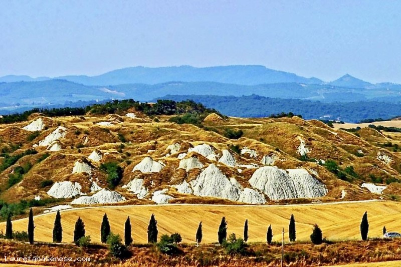 Starting from a crossroads marked by a bald cypress and a temporary deposit of straw presses that can be reached by car passing the castle of Leonina, after having easily parked, you walk towards a lunar landscape that is unique in the world.