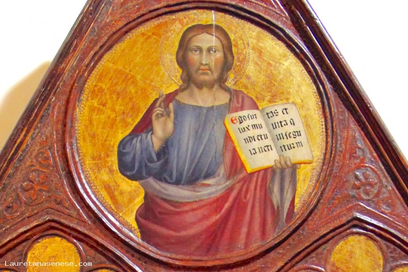 Instead, it is the natural gesture of the other hand, which holds the index between the pages of the book so as not to miss the mark. The angel, on the other hand, holds his arms crossed on his chest in reverence. In the center, just like in Simone Martini, we have a vase with lilies, a symbol of purity, and we see the greeting of the angel, written, which starts from his mouth and reaches the Virgin. In the top circle we have the figure of Christ in the act of blessing.