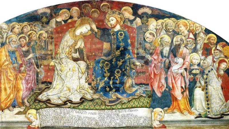 In 1444, at the height of professional fortune, Domenico di Bartolo won the commission to fresco of the Coronation of the Virgin in the room came a public building, which sets only (some have their heads of angels and saints and possibly cardboard) ; the work was completed and signed in 1445 by Sano di Pietro. The suspension of work on public building in the middle of the fifth decade can be hypothetically attributed to poor health.